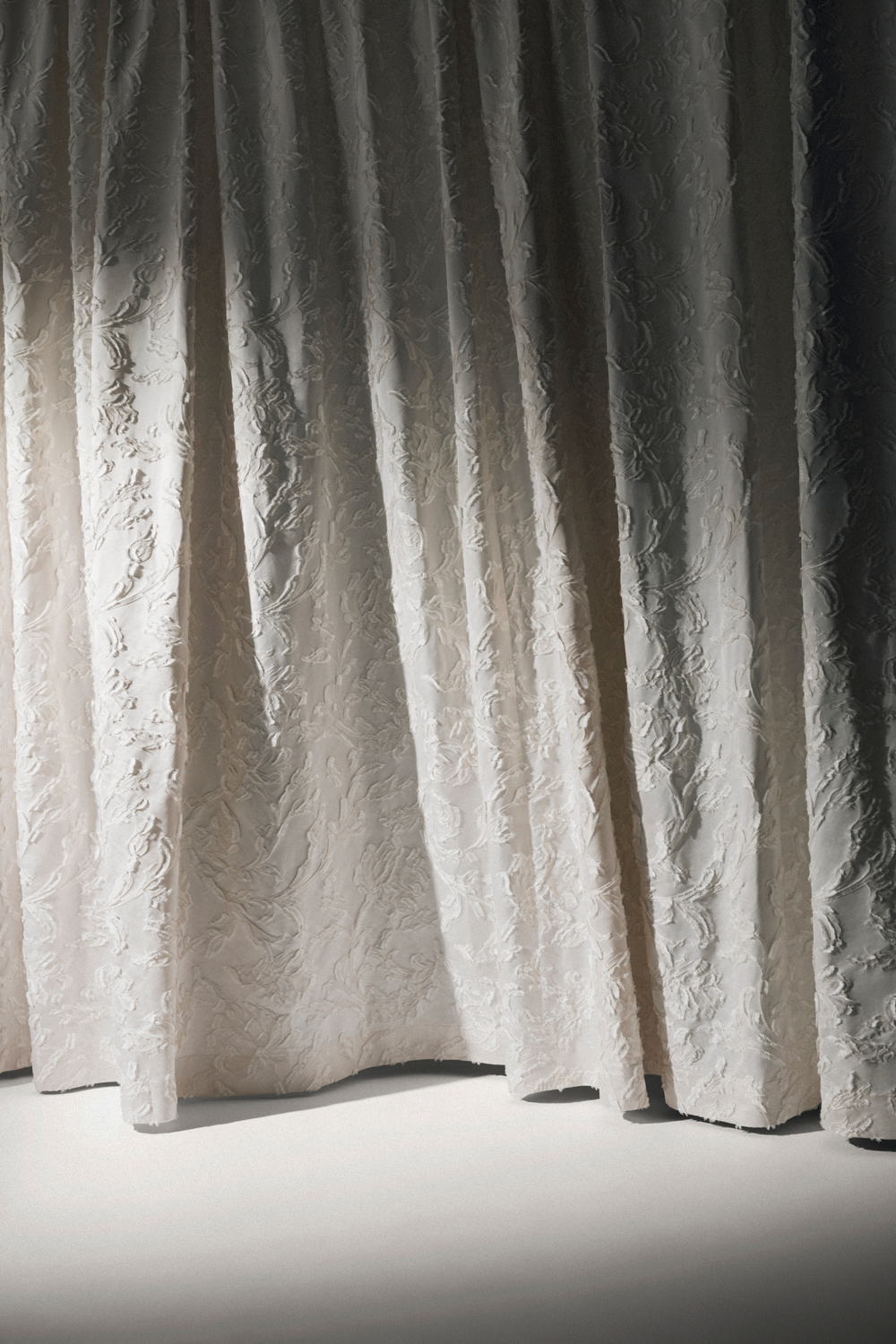 Attraverso un sapiente processo di calandratura, Dhara trasforma un motivo classico in un effetto a rilievo quasi drammatico, dove piccoli punti luminosi emergono da uno sfondo lucido. Partendo da un'opera d'arte orientale del 1830 ritrovata negli archivi del brand, Dhara distilla un motivo complesso in un effetto a rilievo essenziale e drammatico. La calandratura permette a piccoli punti luminosi di emergere dallo sfondo, creando un tessuto che non si limita a coprire, ma scolpisce la luce. La palette cromatica è studiata per integrarsi in ambienti dove la materia è protagonista.