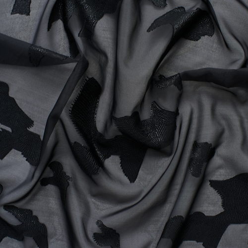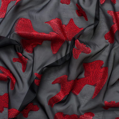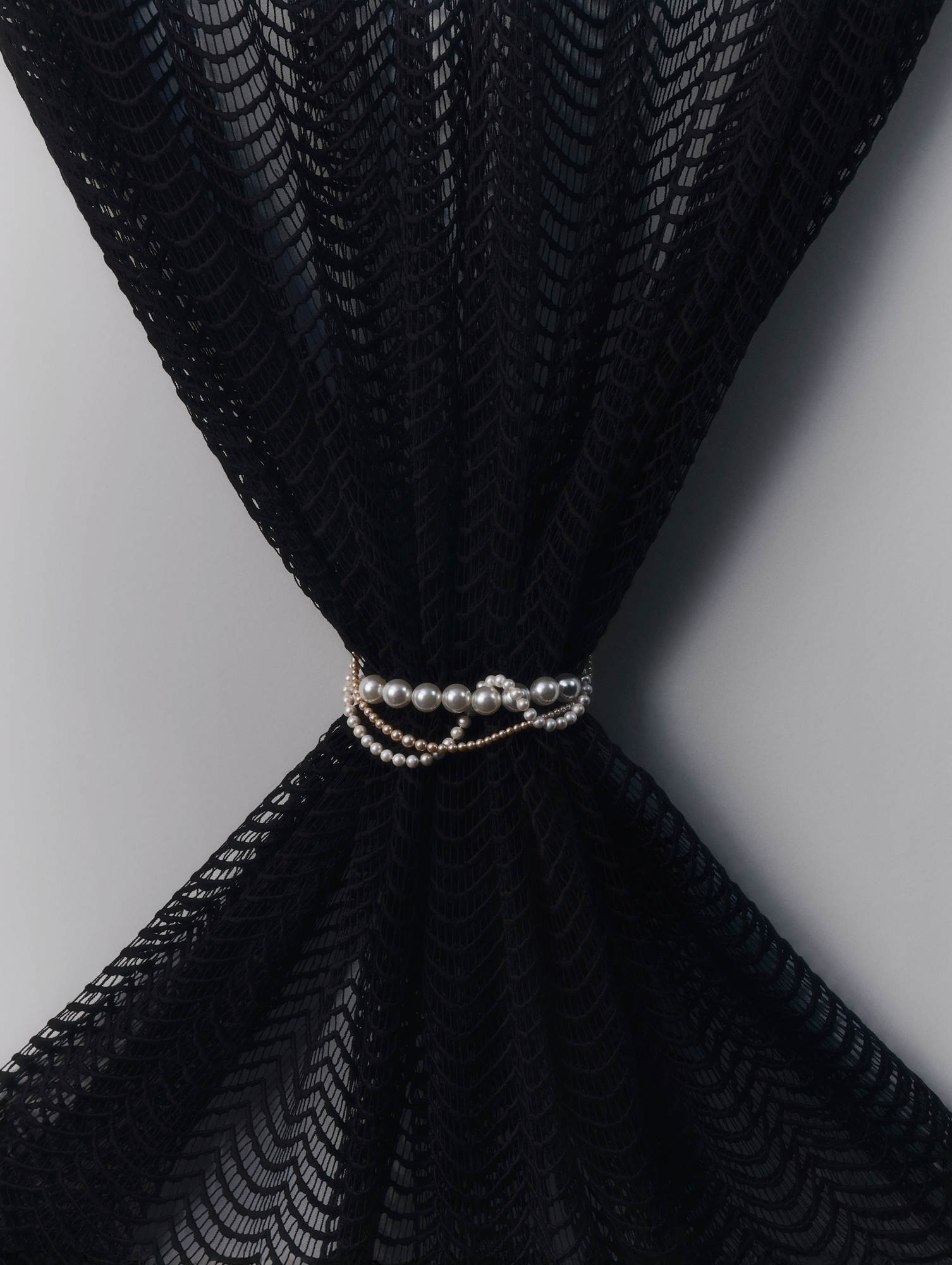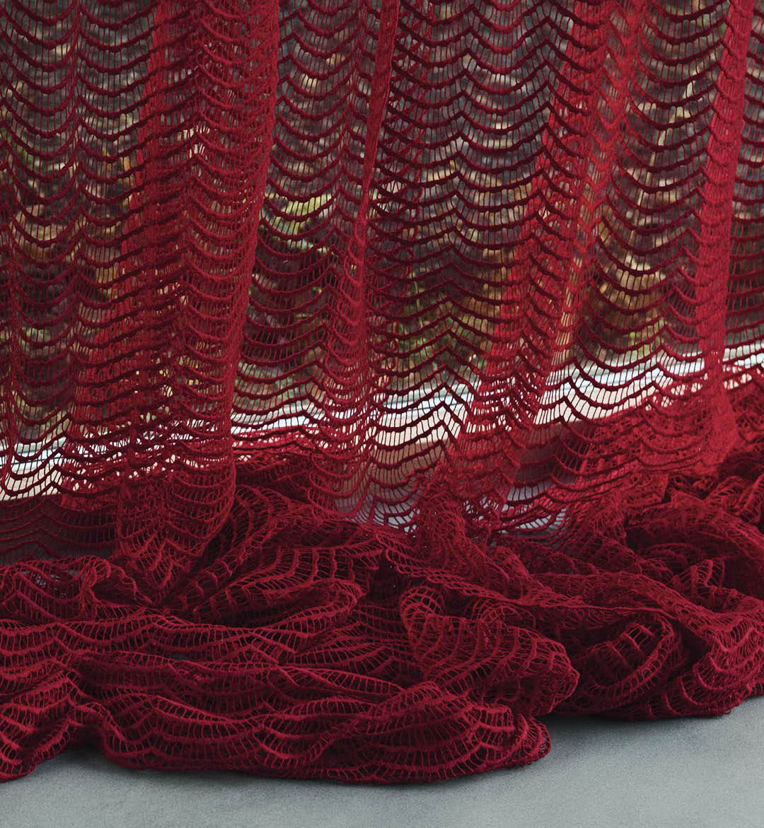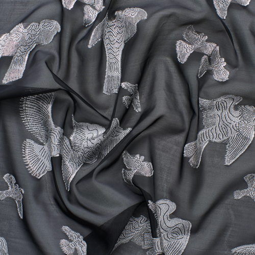 Chara si ispira a un immaginario visivo forte, tra la fotografia di Bettina Rheims e gli uccelli in volo di Mark Borthwick. È un fil coupé jacquard che unisce il tocco glamour del lurex a una trasparenza leggerissima.