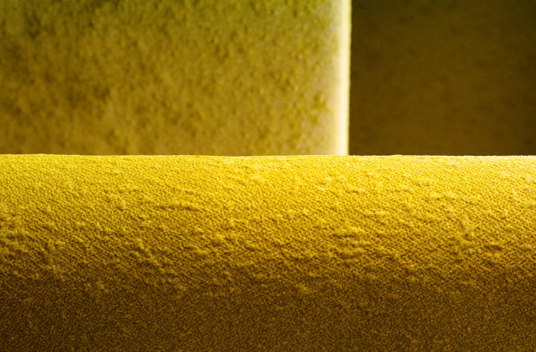 Ognuna delle cinque varianti cromatiche di Myr combina due tonalità dello stesso colore per accentuare la tridimensionalità del tessuto. La palette risultante è ricca e tattile, con un rosso mattone, un grigio industriale e un verde intenso, affiancati da un giallo brillante e da un blu deciso per contrasti dinamici.
