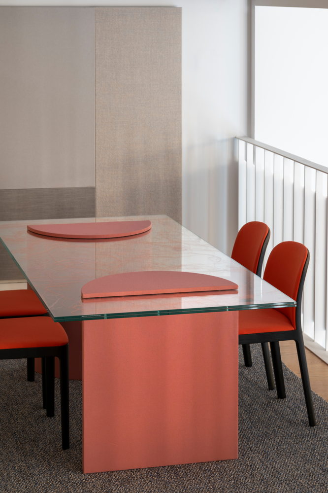 This duality is further explored through an installation of contrasts – between opacity and transparency, softness and structure, the individual and the whole. Inside Kvadrat’s showroom, visitors encounter sculptural tables designed by Kapwani Kiwanga. The pieces feature bases upholstered with the new textile, which support glass tops that capture the ocean-bound polyester yarns used for Diade, in an array of colours. They are complemented by upholstered crescent-like forms that showcase the textile’s excellent functional performance and further glass panels with the suspended yarns, hanging throughout