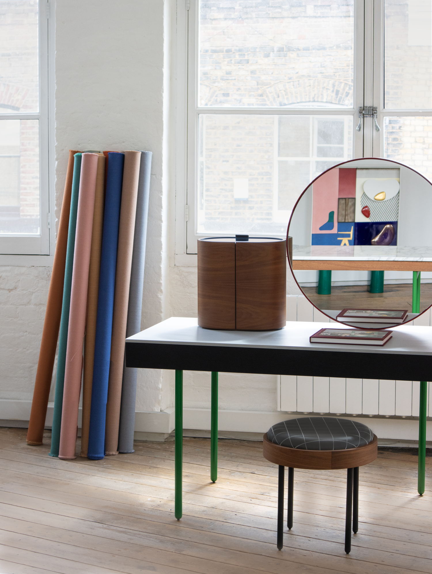 Naveli has a precise micro-check construction and is woven with both thick and thin yarns in different colours. This composition creates playful, delicate deviations in texture and depth. There are two sides to Naveli’s colourways. The textiles woven with an ecru base are understated yet offer a graphic pattern, whereas the others are bolder in colour but with a more subtle pattern. This range suggests opportunities for combining Naveli in its different colours on a single piece of furniture, or across multiple surfaces within the same interior.