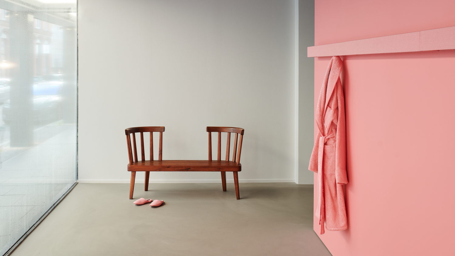 As Simons explains: ‘I was thinking a lot about how I live and how people that I know live. For example, I live in a modernist apartment in Antwerp and the bathroom and bedroom are kind of connected. If I don’t want my bathrobe around, I have to fold it and put it in a closet which, of course you don’t do. You come out of the bath, it’s half wet, you just want to hang it. If it is a beautiful bathrobe or towel and there’s a matching system to hang it on, then it’s a perfect composition of function and aesthetics’.